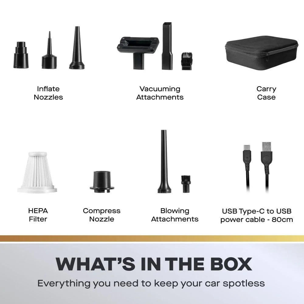 - Versatile accessories - includes tools for vacuuming, inflating and air compression